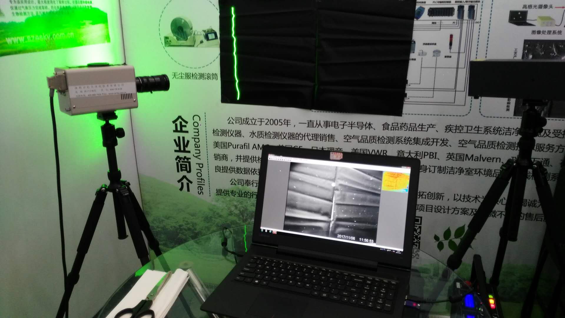 本次展會上,我司還專門展示了一套先進的“微粒子可視化系統”,此系統可以把我們通常潔凈室測試時的微小粒子(0.3微米、0.5微米等等)通過特殊的設備將粒子的大小和運動軌跡通過視頻的方式展現出來,把大家平常測試看不到的東西可視化、直觀化,有利于企業尋找粒子問題的來源、降低環境及產品中顆粒物。